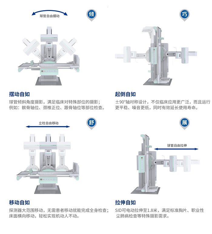 對(duì)稱設(shè)計(jì)床體,配合球管大角度傾斜,可實(shí)現(xiàn)無(wú)死角擺位,滿足臨床各部位、各角度的攝影需求;SID可電動(dòng)拉伸至1.8米,滿足標(biāo)準(zhǔn)胸片和塵肺病鑒定檢查需求;床體起倒自如、移動(dòng)自如,應(yīng)用廣泛,操作便捷。