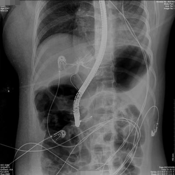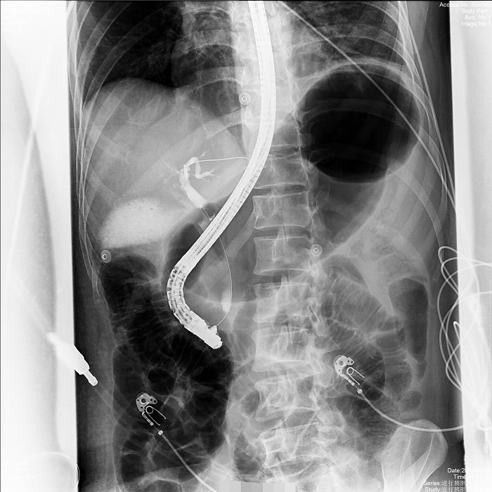 病例1:患者間斷上腹部脹痛4月,經(jīng)磁共振膽道水成像(MRCP)明確為膽總管結(jié)石、膽囊結(jié)石。常規(guī)手術(shù)需要膽總管切開取石,考慮其自身的訴求,醫(yī)生決定嘗試為患者做內(nèi)鏡逆行膽管造影術(shù),幫助實(shí)現(xiàn)最小創(chuàng)傷及快速康復(fù)。術(shù)中,通過十二指腸鏡,將導(dǎo)絲通過十二指腸乳頭(即膽總管的下端開口處)置入膽管內(nèi),在X線透視下注射造影劑造影,完成對膽總管內(nèi)情況診斷,并在診斷基礎(chǔ)之上完成取石治療。